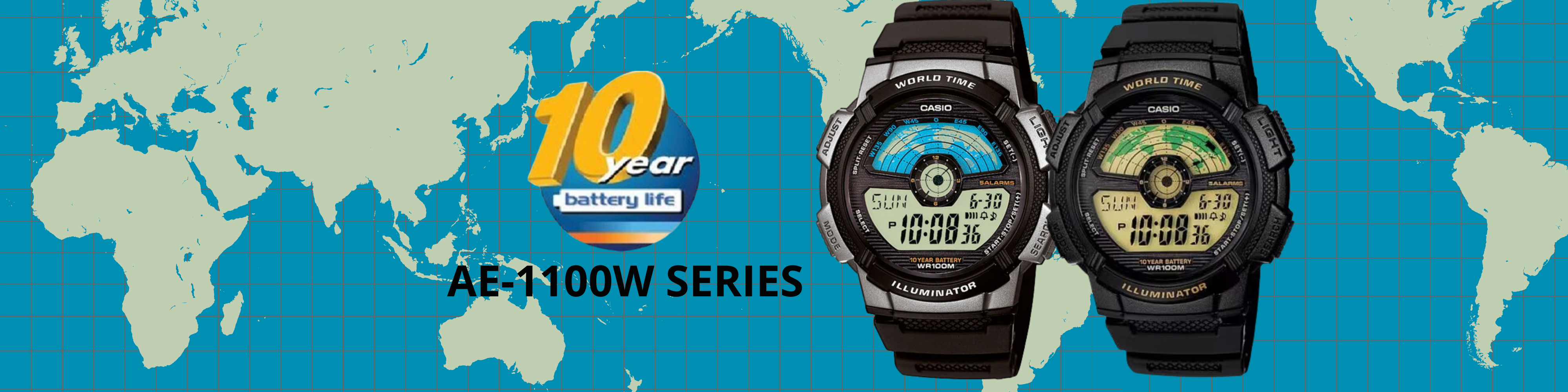 La serie AE-1100W se destaca por su funcionalidad y diseño. Su esfera ofrece un mapamundi panorámico y un reloj análogo en el centro. Con una caja y correa de resina duraderas. La pantalla digital multifuncional permite una lectura clara de la hora, incluso en la oscuridad y ofrece características adicionales como cronómetro, temporizador y hora mundial.